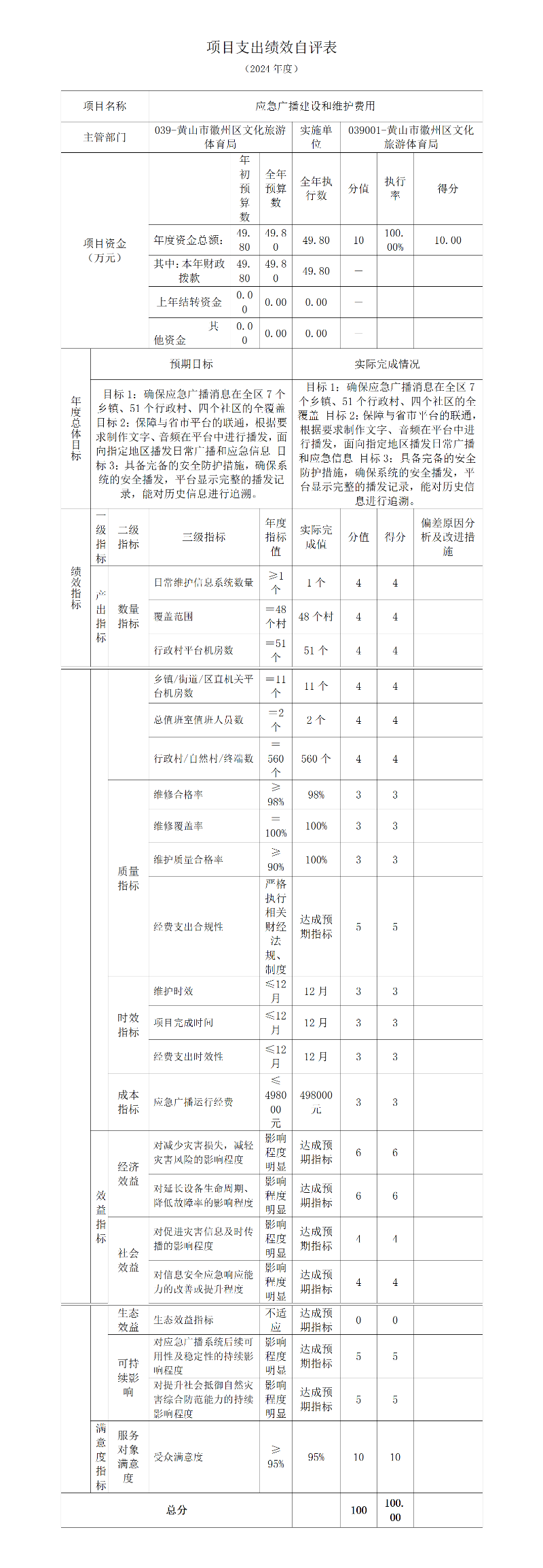 应急广播建设和维护费用项目支出绩效自评表