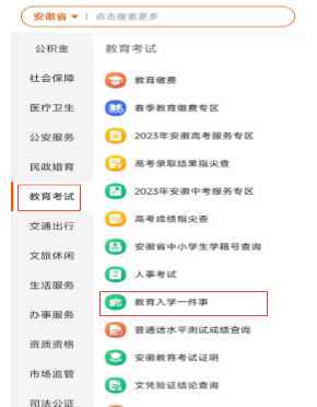 皖事通APP中进入“教育入学一件事”入口,(“更多服务”->“教育考试”->“教育入学一件事”),在区域选择界面选择“黄山市”,或者直接搜索关键字“入学登记”后点击“教育入学一件事”,选择“黄山市”,进入皖事通报名页面。