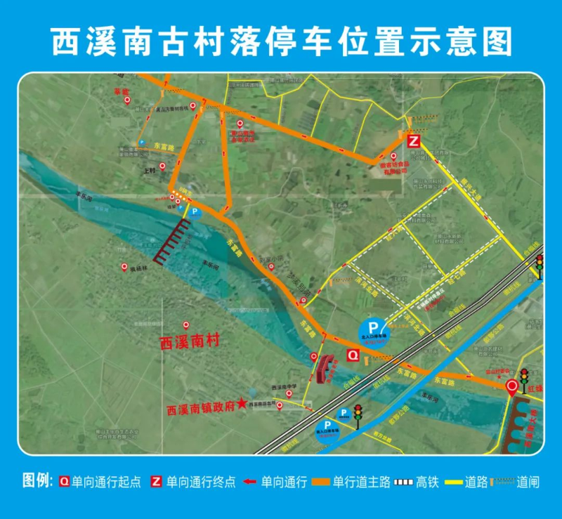 实行单向通行等交通管制措施,单行道入口在富山村路口(向左行驶进入古村落,向右行驶进入工业园车辆临时停靠区),自东南向西北单行,金家农庄闸口、下宅水闸闸口、莘墟闸口