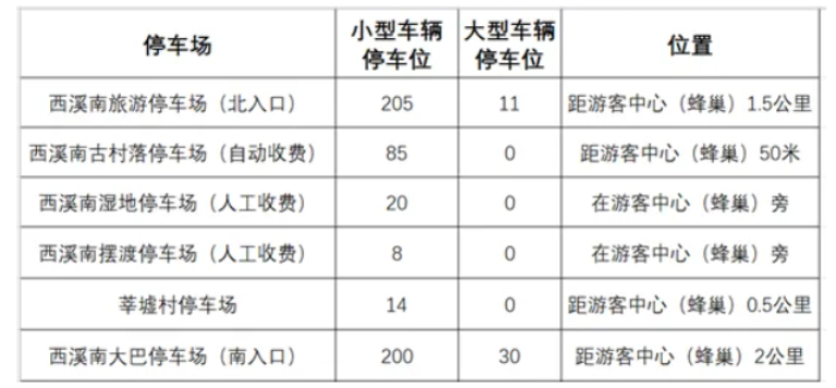 在西溪南古村落(北入口)至莘墟村入口规划了:西溪南北入口停车场,西溪南古村落停车场,西溪南湿地停车场,西溪南摆渡停车场等6个停车场。预设了一定数量的停车容量,其中小型车辆停车位532个,大型车辆停车位41个,满足不同游客的停车需求。