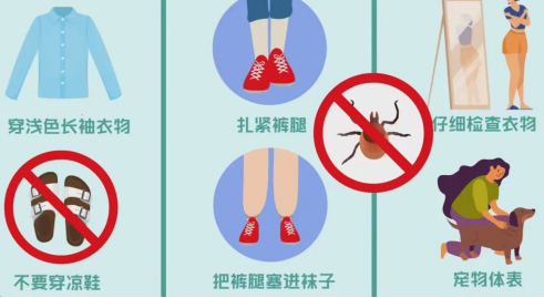 (一)远离蜱虫暴露的环境。避免在蜱类主要栖息地如草地、树林等环境中长时间坐卧。野外劳作或活动时,建议着浅色光滑的长袖衣裤,扎紧裤腿或把裤腿塞进袜子或鞋子里,防止蜱虫进入。