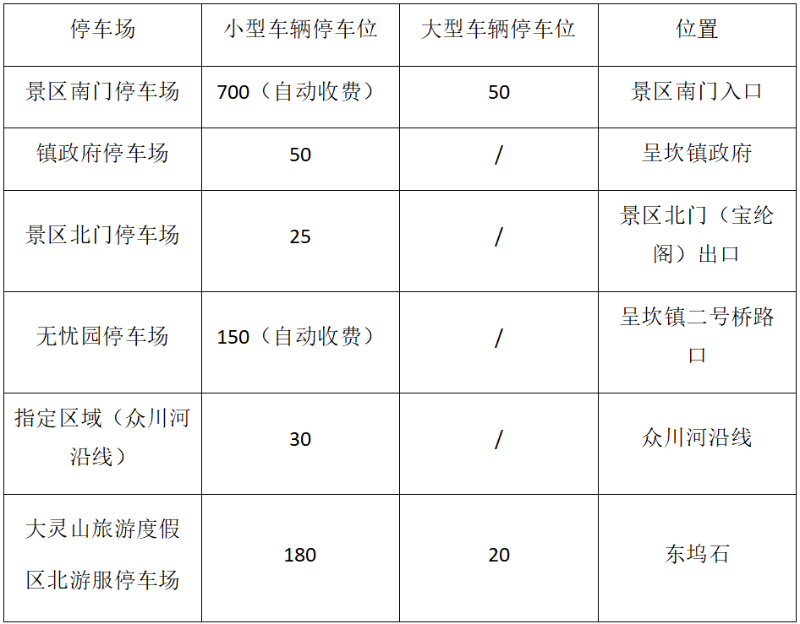 在呈坎镇呈坎村规划有:呈坎景区南门停车场、镇政府停车场、呈坎景区北门停车场、无忧园停车场、大灵山旅游度假区北游服停车场等5个停车场,另设指定停车区域1个。预备了一定数量的停车容量,其中小型车辆停车位1135个,大型车辆停车位70个,满足不同游客的停车需求。除上述停车区域外,呈坎景区其他路段禁止停放机动车。