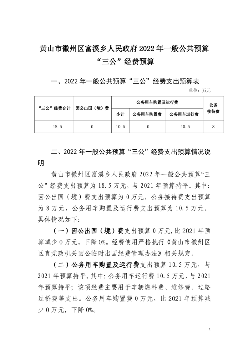 黄山市徽州区富溪乡人民政府2022年一般公共预算“三公”经费预算