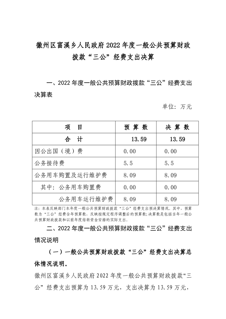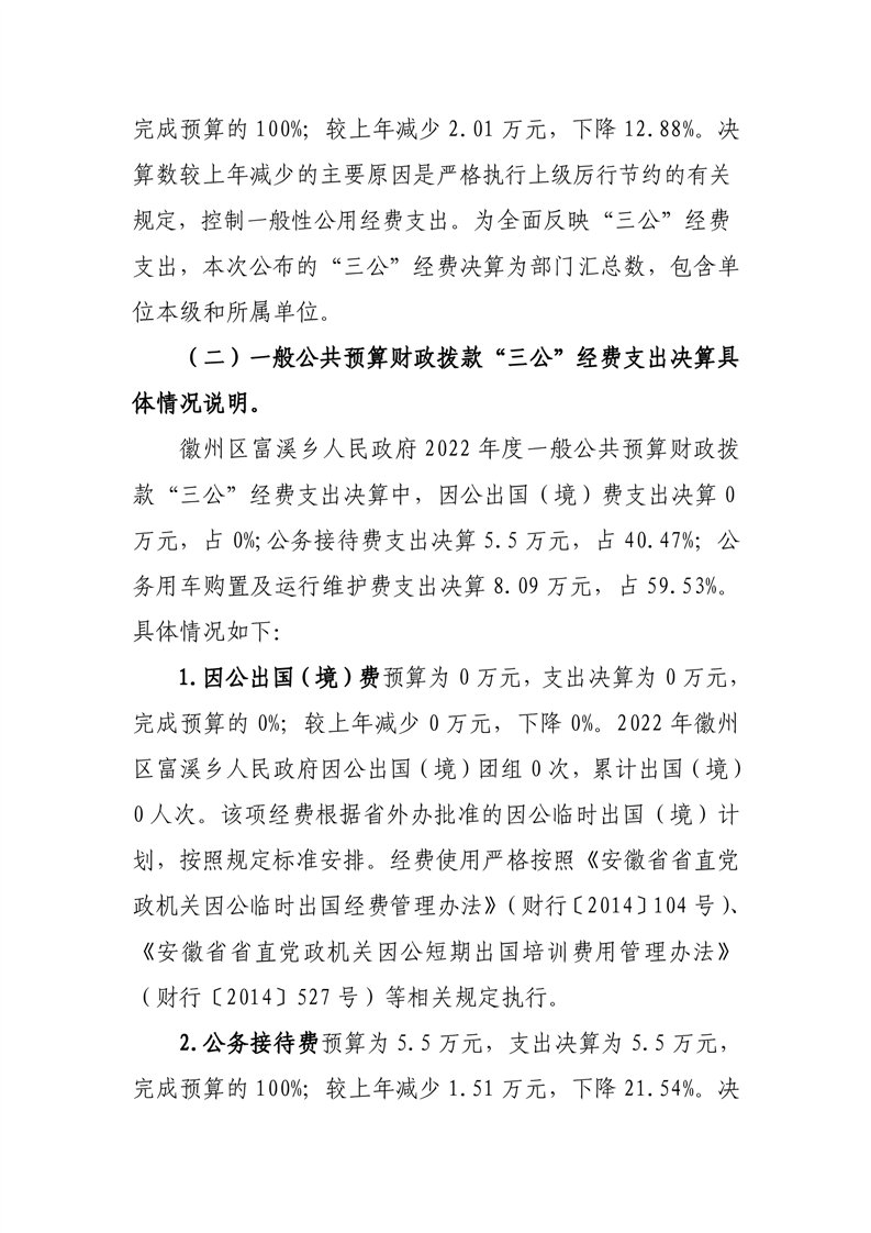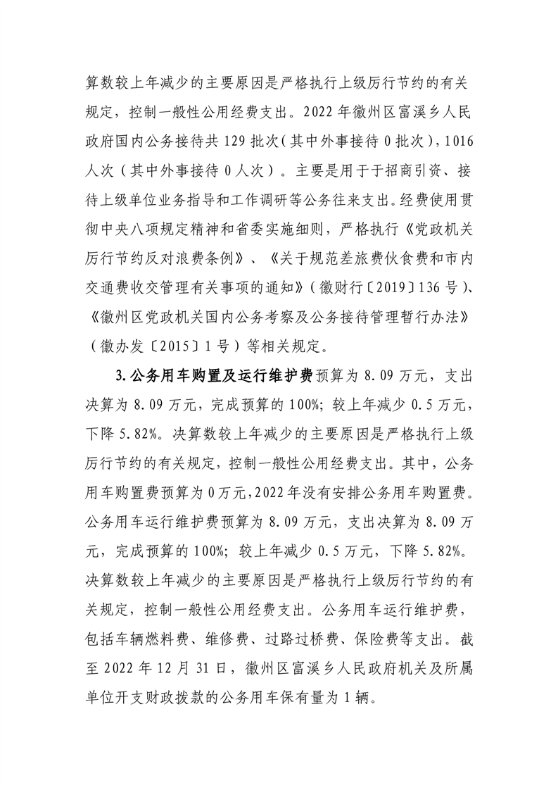 徽州区富溪乡人民政府2022年度一般公共预算财政拨款“三公”经费支出决算