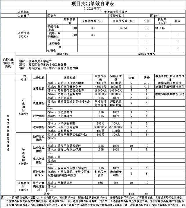 党委机关服务费项目绩效自评综述:根据年初设定的绩效目标,项目绩效自评得分为98分。全年预算数为98万元,执行数为82.49万元,完成预算的83.42%。项目绩效目标完成情况:一是有效保障机关正常运转;二是及时落实区委布置的各项工作任务;三是为各股室、局、中心工作提供后勤保障。发现的主要问题及原因:仍然存在专项经费实际使用不精细的地方。