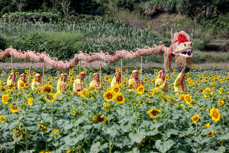 10月4日,在徽州区蜀源村的向日葵花海里,村民舞动草龙庆祝丰收。