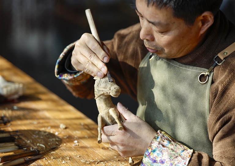 12月27日,国家级非遗项目(徽州竹雕)代表性传承人洪建华以“马”为题,以竹为纸,以刀为笔,正在雕刻作品《马上进宝》。从骏马腾跃的粗犷轮廓,到肌肉的饱满线条,再到鬃毛的精细纹理,作品栩栩如生,令人赞叹。