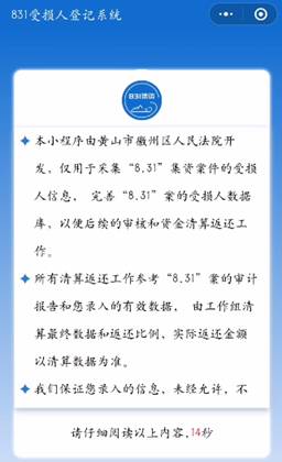 为提高信息核实登记效率,避免人员聚集形成疫情风险,减少集资受损人路途奔波,本次信息登记采用“831受损人登记系统”线上操作,暂不接受线下登记。