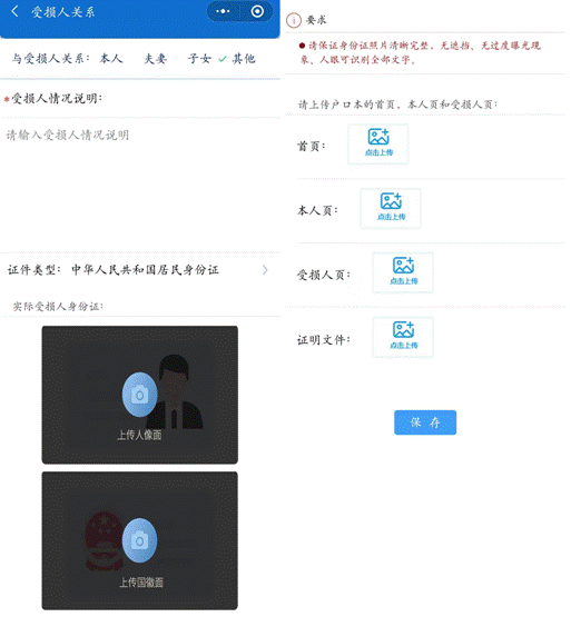 (1)身份信息:信息录入人和受损人身份证信息、户口本信息。