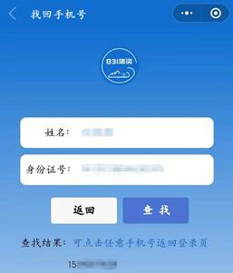 3. 本页“找回手机号”按钮,为非初次信息登记者查询入口,可查询历史信息登记所用手机号码。点击“找回手机号”,进入找回手机号页面,输入信息登记者本人的身份证号码和姓名,点击“查找”,系统返回并列出所有对应的手机号,可直接点击手机号返回登录页面。