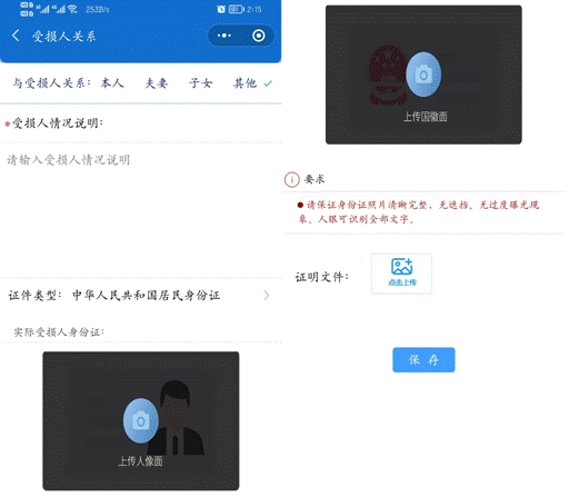 1. 此步骤上传信息登记操作人的身份证,允许为非实际受损人,支持拍照、相册选择两种方式上传,后续图片上传方式相同。所上传的图片均需清晰完整,无遮挡、无过度曝光现象、人眼可识别全部文字。