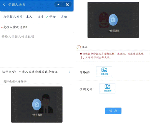 2. 如选择“夫妻”,需说明实际受损人情况,上传实际受损人身份证、结婚证照片。若存在特殊情况,相关证明文件上传至“证明文件”栏。