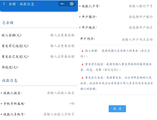 2. “收款信息”为审核通过之后的资金兑付收款账号,请填写准确。