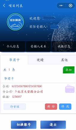 7. 切换账号:点击“切换账号”按钮,可切换其他账号登录,此功能适用于同一个信息登记操作人或手机,录入多名受损人信息的情况。