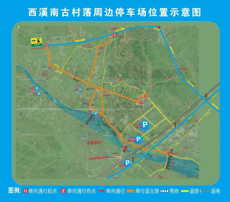 温馨提示:古村落道路两侧(图上橙色区域),禁止车辆停放。