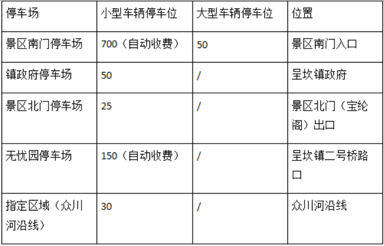 在呈坎镇呈坎村规划有:景区南门停车场、镇政府停车场、景区北门停车场、无忧园停车场等4个停车场,另设指定停车区域1个。预备了一定数量的停车容量,其中小型车辆停车位955个,大型车辆停车位50个,满足不同游客的停车需求。除上述停车区域外,呈坎景区其他路段禁止停放机动车。