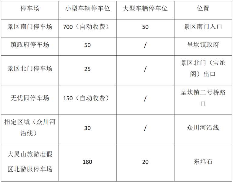 春节假期游客到度假区(灵山景区)车辆可停放在南、北停车场(南停车场为罗祁段路口、北停车场为乌石路口)以及南停车场至北停车场路段沿线停车位,游客可以选择以下方式和线路进入灵山核心景区。